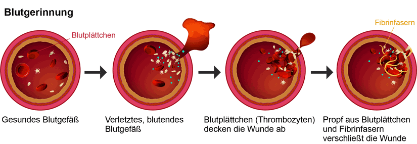 Um zu verstehen, warum eine Krebserkrankung ein schwerwiegender Risikofaktor für Thrombose ist, muss man sich das Krankheitsbild der Thrombose ansehen. Eine Thrombose hängt mit der Gerinnungsfähigkeit des Blutes zusammen. Sobald ein Blutgefäß verletzt ist, setzt die Blutgerinnung ein und sorgt dafür, dass die Wunde schnell verschlossen wird. An diesem komplizierten Vorgang, der oft als Gerinnungskaskade bezeichnet wird, sind Blutplättchen (Thrombozyten) sowie verschiedene Proteine, sogenannte Gerinnungsfaktoren, beteiligt. Die Blutplättchen lagern sich zunächst rund um die Wunde an und decken diese ab. Gleichzeitig werden nach und nach verschiedene Gerinnungsfaktoren aktiviert, so dass die Ansammlung der Blutplättchen schließlich von einem Netz aus Proteinfasern (Fibrinfasern) zusammengehalten wird. Dieser Pfropf, der zum Verschluss der Wunde führt, wird als Blutgerinnsel oder Thrombus bezeichnet. Nachdem die Wunde verheilt ist, löst sich normalerweise der Thrombus wieder auf.